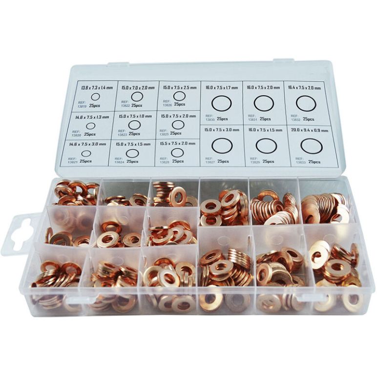 INJECTOR-KUPFERRINGE, ZUSAMMENSTELLUNG 375 STKIncluye 375pcs:_x000D_ 25uds de 13,8x7,3x1,4mm (ref. 13819)_x000D_ 25uds de 14,6x7,5x1,3mm (ref.13820)_x000D_ 25uds de 14,6x7,5x3,0mm (ref. 13821)_x000D_ 25uds de 15,0x7,0x2,0mm (ref. 13822)_x000D_ 25uds de 15,0x7,5x1,0mm (ref. 13823)_x000D_ 25uds de 15,0x7,5x1,5mm (ref. 13824)_x000D_ 25uds de 15,0x7,5x2,0mm (ref. 13825)_x000D_ 25uds de 15,0x7,5x2,5mm (ref. 13826)_x000D_ 25uds de 15,0x7,5x3,0mm (ref. 13827)_x000D_ 25uds de 15,5x7,5x2,0mm (ref. 13828)_x000D_ 25uds de 16,0x7,5x1,5mm (ref. 13829)_x000D_ 25uds de 16,0x7,5x1,7mm (ref. 13830)_x000D_ 25uds de 16,0x7,5x2,0mm (ref. 13831)_x000D_ 25uds de 16,4x7,5x2,0mm (ref. 13832)_x000D_ 25uds de 20,0x9,4x0,9mm (ref. 13833)