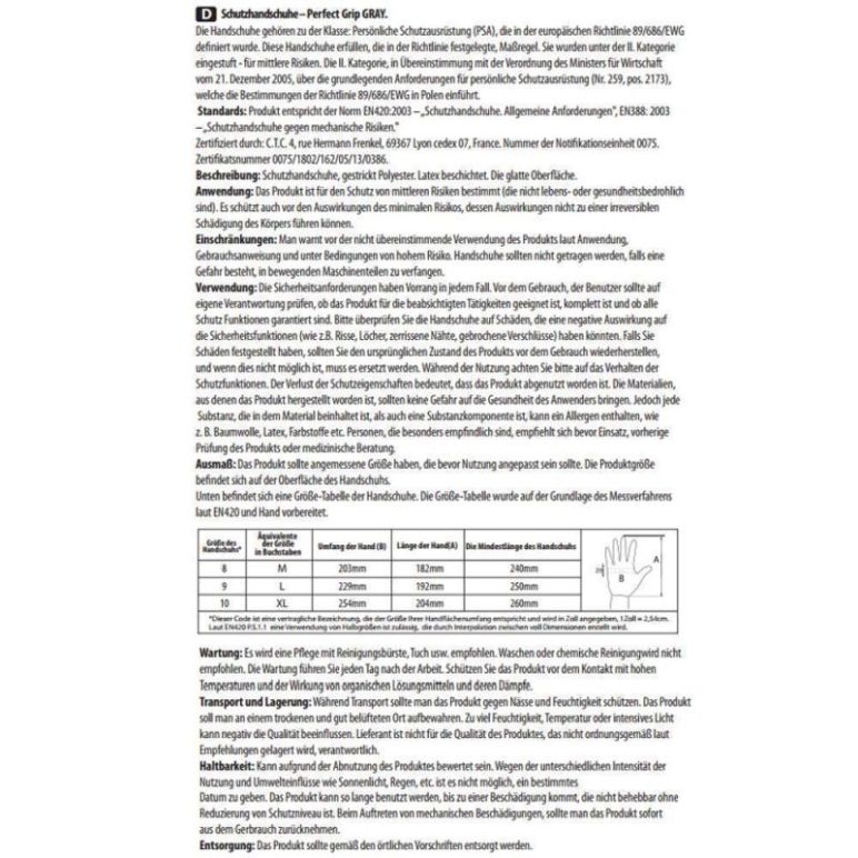 Mit angerautem Latex beschichtete Arbeitshandschuhe in Beige oder Grau Die Arbeitshandschuhe sind aus gestickten Polyester mit Latexbeschichtung. Durch die raue Latexbeschichtung sorgt der Handschuh für einen optimalen Halt. Die Schutzhandschuhe schützen vor mechanische Einwirkungen. Die Sicherheitshandschuhe sind ideal für Haus, Garten und Auto, sowie Montage-, Sortier-, Transport- und Verpackungsarbeiten. Jedes Paar Handschuhe besitzt eine Hängevorrichtung. Material: gestrickten Polyester mit Latexbeschichtung raue Beschichtung reißfest sehr gute Passform fusselarm sicher und perfekter Griff gutes Tastempfinden atmungsaktiv sehr beständig mit Hängevorrichtung ideal für Haus, Garten und Auto, sowie Montage-, Sortier-, Transport- und Verpackungsarbeiten Farbe: braun, grau Größe: 8-10 Norm: EN 388, EN 420 Widerstand: 3 1 3 1   Größe Umfang der Hand Länge der Hand Mindestlänge des Handschuhs 8 (M) 203mm 182mm 240mm 9 (L) 229mm 192mm 250mm 10 (XL) 254mm 204mm 260mm