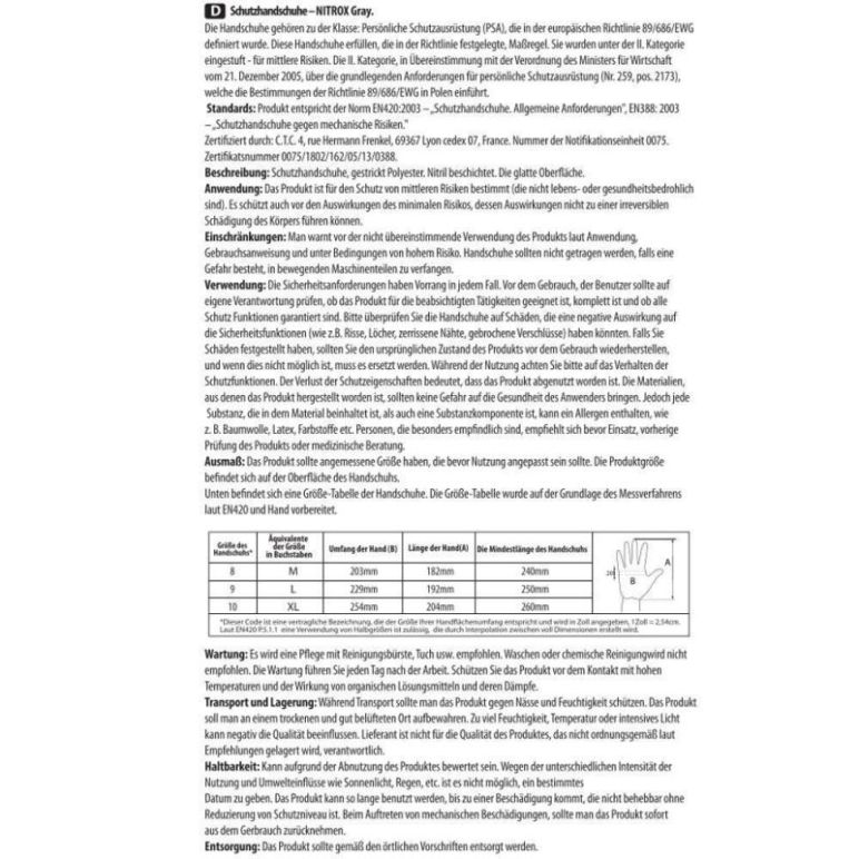 Öl- und lebensmittelresistente Nitril Arbeitshandschuhe Die hochwertigen Arbeitshandschuhe sind aus Polyester-Gewebe mit Nitrilbeschichtung. Die Schutzhandschuhe sind gegen Öle, Fette, Kohlenwasserstoffe und Lösemittel beständig Die Sicherheitshandschuhe sind ideal für Haus, Garten und Auto, sowie Montage-, Sortier-, Transport- und Verpackungsarbeiten. Material: Polyester-Gewebe mit Nitrilbeschichtung sehr beständig glatte Oberfläche fusselarm sicherer und perfekter Griff gutes Tastempfinden atmungsaktiv elastische Manschette für Haus, Garten und Auto ,sowie Montage-, Sortier-, Transport- und Verpackungsarbeiten Größe: 8-10 Farbe: grau/blau Norm: EN 388, EN 420 Widerstand: 3 1 2 1   Größe Umfang der Hand Länge der Hand Mindestlänge des Handschuhs 8 (M) 230mm 182mm 240mm 9 (L) 229mm 192mm 250mm 10 (XL) 254mm 204mm 260mm
