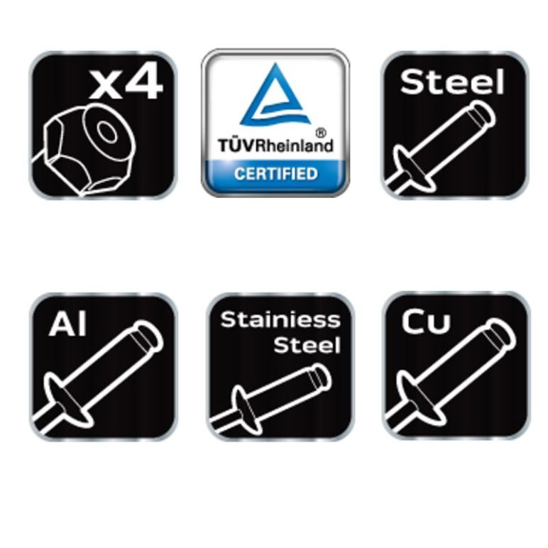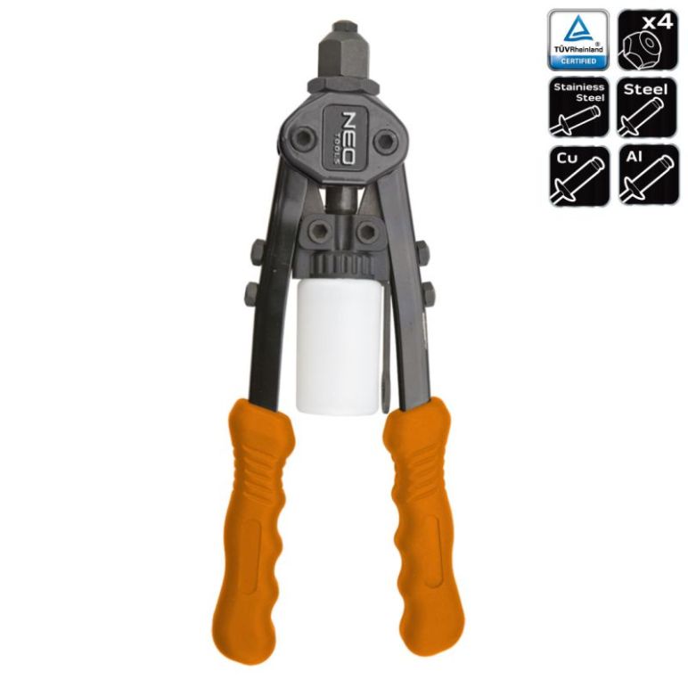 Blindnietzange für schwer zugängliche Stellen Die Neo Profi Blindnietzange ist mit 4 auswechselbaren Mundstücken ausgestattet. Abgerundet wird die Blindnietzange durch die Ergonomisch geformten Griffe die für ein gutes Gefühl bei der Arbeit sorgen. Geeignet für: Aluminium, Stahl, Edelstahl und Kupfernieten. technische Daten:   Nietdurchmesser: Ø 2.4mm, Ø 3.2mm, Ø 4.0mm und Ø 4.8mm Gesamtlänge: 275mm 3 Backengriffe Ergonomische Griffe Schnellwechselbackenmechanismus Gewicht: 0,75kg Farbe: schwarz / orange 2 Jahre Herstellergarantie Garantieinformation