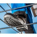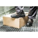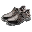 NEO Tools-Sicherheitssandalen Die Schutzsandalen aus Vollleder bieten einen grundlegenden Schutz bei der Arbeit. Sie bestehen aus hochwertigem Leder mit Ausschnitten für Luftzirkulation und dadurch mehr Arbeitskomfort bei hohen Temperaturen in Innenräumen, als auch Außenbereichen. Die stoßdämpfenden Sohlen sind rutschfestem Natriumlaurylsufalt und mit Glycerol überzogen, wodurch sie ebenfalls zur Sicherheit und Komfort beim Arbeiten beitragen. Durchtrittschutz wird durch Keramik gewährleistet. Die verstärkte Stahlkappe schützt vor mechanischen Verletzungen und hält Einschlägen von bis zu 200 J stand. Das weiche Innenfutter unterbindet Blasenbildung am Fuß. Technische Details: Schuhhöhe: Halbschuh Typ Schuh: Sandale aus Leder Schutzkappe: Stahl Schutzklasse: S1 Sohle: Aus Natriumlaurylsulfat (SLS) mit Glycerol überzogen Rutschfestigkeit: SRA Durchtrittsichere Einlage: Keramik Sicherheitskategorie Sicherheitsklasse Bedeutung SB Grundanforderungen S1 Zusatzanforderungen (A+FO+E) S1P Zusatzanforderungen (A+FO+E+P) S2 wie S1, zusätzlich bedingte Wasserdichtigkeit (A+FO+E+WRU) S3 wie S2 und zusätzlich durchtrittsicher (A+FO+E+WRU+P) S4 wie S2, aber als wasserdichter Stiefel S5 wie S4, zusätzlich durchtrittsicher Zusatzkategorie Klasse Bedeutung A antistatische Schuhe AN Fußknöchelschutz C leitfähige Schuhe CI Kälteisolierung (Probe bei -20 °C) CR Schnittfestigkeit E Energieaufnahme im Fersenbereich FO öl- und benzinresistente Sohle HI Wärmeisolierung HRO Verhalten gegenüber Kontaktwärme (Wärmebeständigkeit der Sohle bei 300 °C in Minuten) I elektrisches Isolierschuhwerk M Mittelfußschutz P Durchtrittsicherheit SRA Rutschhemmung (Testverfahren: Keramikfliese/Reinigungsmittel) SRB Rutschhemmung (Testverfahren: Stahlboden/Glycerin) SRC Rutschhemmung (Testverfahren: SRA und SRB bestanden) WR Beständigkeit des gesamten Schuhs gegen Wasserdurchtritt und Wasseraufnahme WRU Beständigkeit des Schuhoberteils gegen Wasserdurchtritt und Wasseraufnahme