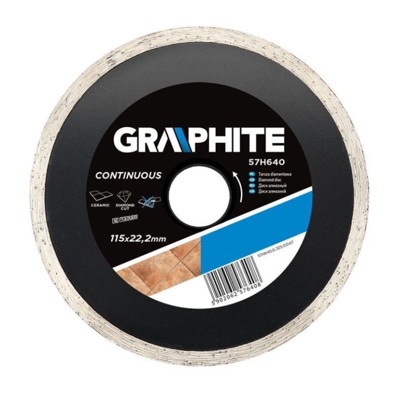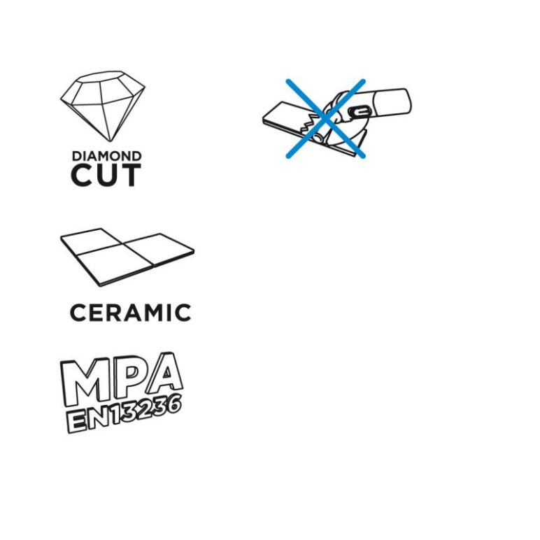 Diamant Trennscheibe 115-230mm Diese Diamant Trennscheibe eignet sich bestens für Arbeiten an Terrakotta, Keramik, Granit, Marmor, etc.. Durch den hochwertigen und strapazierfähigen Diamant Schneidrand ist ein sauberer und effizienter Schnitt gewährleistet.   Technische Daten hochwertiger Diamant Schneidrand Nass- und Trockenschnitt von Fliesen, Marmor und Terrakotta, Granit Diamantschliff zum Schleifen nicht geeignet Innendurchmesser: 22mm Größen: 115, 125, 180, 200, 230mm Norm EN 13236 Scheibendurchmesser empfohlene Schnitttiefe mm maximale Umdrehung/Minute Innendurchmesser 115 50 13290 22,2 125 60 12230 22,2 180 80 8490 22,2 200 90 7640 25,4 230 110 6650 22,2