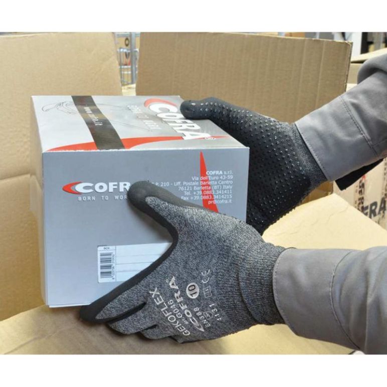 Mit unserem Nitril Noppen-Arbeitshandschuh sind Sie bei der Arbeit bestens ausgestattet ! Die Hand ist nahezu bei allen täglichen Verrichtungen eines der wichtigsten Werkzeuge. Daher ist die richtige Auswahl von Handschuhen hier sehr wichtig. Der hochwertige Arbeitshandschuh begeistert mit seiner hervorragenden Beweglichkeit und Reißfestigkeit . Das Innenfutter besteht aus wasserabweisendem Nylon . Dank der perfekten Griffigkeit eignet sich der Nitril Handschuh bestens für Arbeiten mit Kleinteilen und sitzt wie eine zweite Haut . Nitril verstärkt den Handschuh und seinen Mechanikwiderstand. Der Handschuh zeichnet sich durch seine Flexibilität, Dehnbarkeit und Atmungsaktivität aus und wird daher in den Bereichen Industrie, Wartungsarbeiten, Baugewerbe und vieles mehr angewandt. Anwendungsgebiete: Ausstattungsarbeiten, Industrie, Baugewerbe, Lager, Handhabung von Kleinteilen, Wartung, Montagearbeiten technische Daten: hervorragende Beweglichkeit hohe Grifffestigkeit und Reißfestigkeit Griffigkeit: Trockengriff, Nassgriff optimale Flexibilität und Atmungsaktivität reiß- und verschleißfest gutes Tastempfinden, daher optimal geeignet für Arbeiten mit Kleinteilen   hohe Dehnbarkeit Widerstand: 4 1 3 1X  Kategorie: CAT. II Normen: EN 420, EN 388 Hersteller: Cofra Modell: Gekoflex Farbe: grau/schwarz Größe: 7-11 (S-XXL) Gewicht: 0,050 kg Material: Beschichtung: Nitril/Polyurethan (geruchsneutral) Futter: wasserabweisendes Nylon, optimale Handfertigkeit und Leichtheit Wasserabweisender Handrücken   Handfläche mit Noppen aus Nitril Größe Handmass/Umfang (mm Länge (mm) Mindestlänge des Handschuhs (mm) 6 (XS) 152 160 220 7 (S) 178 171 230 8 (M) 203 182 240 9 (L) 229 192 250 10 (XL) 254 204 260 11 (XXL) 279 215 270