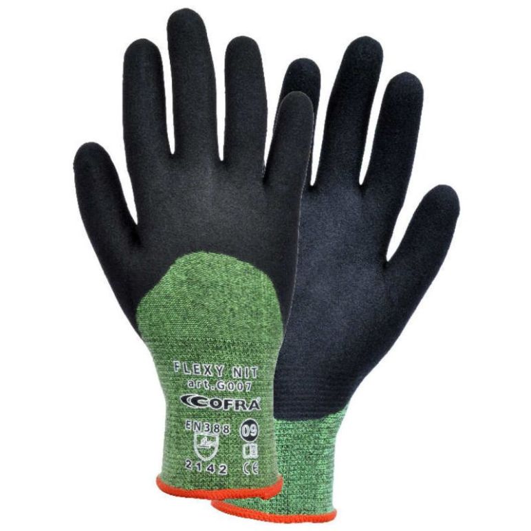 Arbeiten Sie viel mit öligen Oberflächen? Dann sind unsere Nitra-X Arbeitshandschuhe genau das Richtige für Sie ! Die Hand ist nahezu bei allen täglichen Verrichtungen eines der wichtigsten Werkzeuge. Daher ist die richtige Auswahl von Handschuhen hier sehr wichtig. Mit Öl arbeiten und es gar nicht spüren ist dank diesem Arbeitshandschuh aus Nitra-X nun möglich. Das spezielle Material besteht aus einer atmungsaktiven und zweischichtigen Mischung , was eine hohe Grifffestigkeit auf nassen und öligen Oberflächen bietet. Der Handschuh zeichnet sich durch seine hervorragende Elastizität und Passform  aus und erleichtert dadurch die Handbewegungen, ohne Stress und Spannung. Durch die thermoregulierende Eigenschaft der Handfläche bleiben die Hände trocken und frisch. Lange Tragezeiten werden dank einer neuen doppelten Schicht und der guten Dehnbarkeit ermöglicht. Abgerundet wird der Schutzhandschuh mit einem Innenfutter aus Baumwolle, welches Feuchtigkeit aufnimmt und dadurch Schweißbildung vermeidet . Anwendungsgebiete: Baugewerbe, ideal für mittlere bis schwere mechanische Tätigkeiten, Lager, Handhabung von Kleinteilen, Montagearbeiten technische Daten: Griffigkeit: ölbeständig Doppelbeschichtung hohe Atmungsaktivität, Elastizität und Flexibilität hohe Grifffestigkeit und Beweglichkeit optimale Passform hoher Tragekomfort gutes Tastempfinden, daher optimal geeignet für Arbeiten mit Kleinteilen   hohe Dehnbarkeit Widerstand: 2 1 4 2  Kategorie: CAT. II Normen: EN 420, EN 388 Hersteller: Cofra Modell: Flexynit Farbe: grün/schwarz Größe: 7-11 (S-XXL) Gewicht: 0,047 kg Material: Nitril Futter: Baumwolle, Polyester, Elasthan (Schweißbildung wird vermieden) Beschichtung: Nitra-X Nitril (atmungsaktive zweischichtige Mischung, für Griffigkeit auf öligen/nassen Flächen) Handfläche: Baumwolle (garantiert gute thermoregulierende Eigenschaft und hält die Hände frisch/trocken) Größe Handmass/Umfang (mm Länge (mm) Mindestlänge des Handschuhs (mm) 6 (XS) 152 160 220 7 (S) 178 171 230 8 (M) 203 182 240 9 (L) 229 192 250 10 (XL) 254 204 260 11 (XXL) 279 215 270