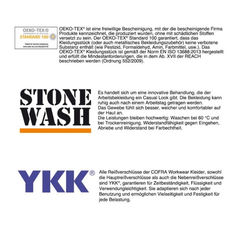 Arbeitshose COFRA HELSINKI, kurze und lange Hose 2 in 1 Mit der Arbeitshose Helsinki der Firma Cofra sind Sie für alle anfallenden Aufgaben im tagtäglichen Arbeitsablauf bestens gewappnet. Die gutgeschnittene und widerstandsfähige Hose überzeugt durch den Mix aus hoher Funktionalität und ihrer Anpassbarkeit (als 2 in 1 kurze und lange Arbeitshose) auf ganzer Linie. Egal ob Baugewerbe, Industrie oder Logistik – vertrauen Sie auf eine Bekleidung, mit der Sie in jeglichen Szenarien erstklassig vorbereitet sind. Besonderheiten auf einen Blick: 2 in 1 - Kurze Hose und lange Hose (Beinteile mit Reißverschluss lösbar) Formstabiles und abriebrobustes Baumwollmaterial von hoher Qualität Für den Einsatz in vielen verschiedenen Szenarien geeignet Die ergonomische Gestaltung gewährleistet einen hohen Tragekomfort Qualitätsprodukt ohne schädliche Stoffe An der freiwilligen Bescheinigung OEKO-TEX lässt sich bei dieser hochqualitativen Arbeitshose direkt erkennen, dass während des Produktionsprozesses keinerlei schädliche Stoffe zum Einsatz gekommen sind. Verbotene Substanzen, wie beispielsweise Pestizide, Amin, Farbmittel oder auch Formaldehyd, können somit zu jedem Zeitpunkt ausgeschlossen werden. Die Eigenschaften der Arbeitshose bleiben auch nach Waschgängen zu jedem Zeitpunkt erhalten. Sie müssen keinen Farbverlust oder ein Eingehen der Hose befürchten. Alle Reißverschlüsse kommen außerdem mit der „YKK “ -Technologie daher. Diese stellt sicher, dass bei allen Haupt- und Nebenreißverschlüssen die Punkte Langlebigkeit und Festigkeit zu tragen kommen. Vielzahl an Taschen und Verstaumöglichkeiten Die Hose gewährleistet zu jedem Zeitpunkt, dass Sie ein überdurchschnittlich hohes Maß an Flexibilität genießen können. Mit Hilfe der integrierten und gut erreichbaren Hammerschlaufe lässt sich das Werkzeug schnell packen und im Umkehrschluss auch ausgezeichnet platzieren. Die links von der Hose angebrachte Seitentasche und das Stiftfach stehen dem benutzerfreundlichen Charakter in nichts nach. Die Zollstocktasche rundet das ohnehin schon beachtliche Gesamtprofil gekonnt ab. Mit nur einem Handgriff verschwinden wichtige Arbeitsutensilien mühelos und zeitsparend. Sowohl die Seitentasche als auch eine der hinteren Gesäßtaschen, weisen eine Patte auf, um dem Herausfallen von Tascheninhalten zu vermeiden. Technische Merkmale: Lange Hose kann leicht am Reißverschluss zu kurzer Hose umgewandelt werden Gut platzierte Gesäßtaschen, davon eine mit Patte Hammerschlaufe Individuell einstellbarer Bund Links angebrachte Seitentasche mit Patte Stiftfach Zollstocktasche YKK® Reißverschlüsse kein Erkennen von Metalldetektoren 100% Baumwolle Canvas EN ISO 13688