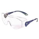 Schutzbrille für Brillenträger mit exzellenter Anpassung an alle Gesichtformen Die hochwertige Schutzbrille ist leicht (40 g) und trotzdem sehr stabil. Die Brillengläser bestehen aus Polycarbonat. Die spezielle Beschichtung vermeidet das Beschlagen und verbessert die Sicht bei kritschen Bedingungen. Die Bügel bestehen aus Polycarbonat und lassen sich in der Länge und im Winkel stufenlos einstellen. Die weichen Enden sorgen für einen angenehmen Tragekomfort. Diese Überbrille eignet sich auch ideal für Besucher. Anwendungsgebiete: Indoor -mechanische Tätigkeiten mit guten Sichtverhältnissen technische Daten: kratzfest: 5cd/(m²lx) 4,29 beschlagfrei UV-Schutz Krümmung: 3   weiche Einlage am Ende der Bügel Norm: EN166 - EN170 Farbe Gläser: farblos Gewicht: 40g Material: Gläser: Polycarbonat Gestell: Polycarbonat + Nylon + TRP
