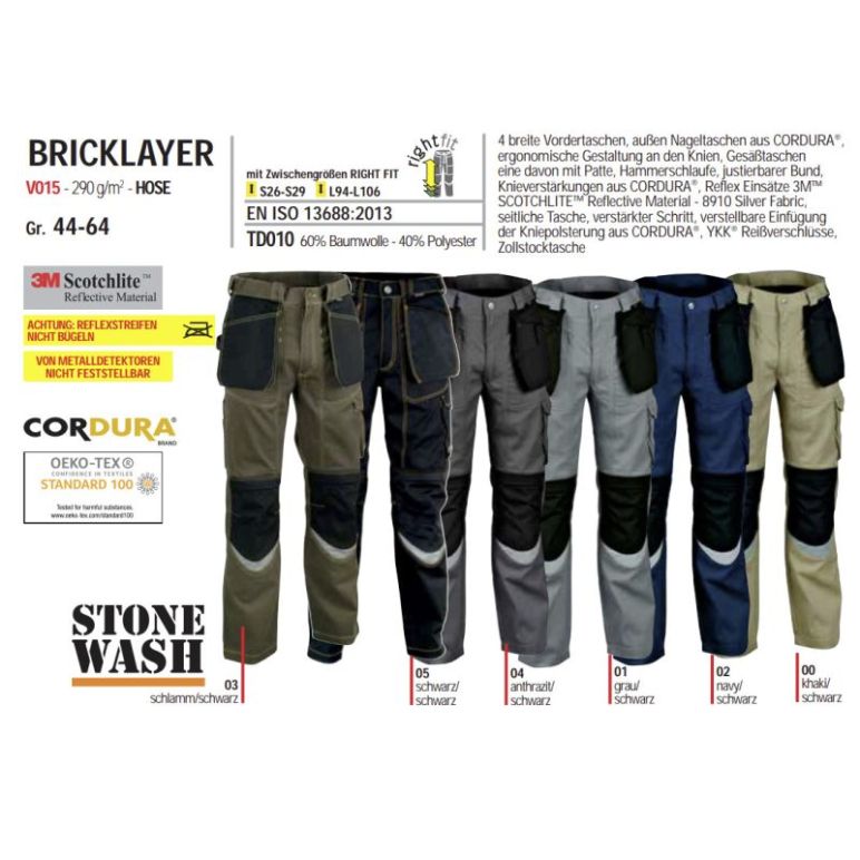 COFRA Arbeitshose BRICKLAYER Wenn eine Arbeitshose viel aushalten muss, dann ist diese Hose zum Arbeiten perfekt. Sie ist außerordentlich widerstandsfähig, reißfest, abriebfest und zerreißfest. Auch nach 50 Wäschen garantiert die Qualitätsfirma Cofra eine hohe Leistung. Besonderheiten auf einen Blick: Hohe Strapazierfähigkeit Kniebereich aus extra widerstandsfähigem Material Einlegen einer extra Kniepolsterung möglich Hohe Anzahl an Taschen   Widerstandsfähige Arbeitshose mit extra vielen Taschen Über das Unterbringen von viel Werkzeug muss man sich bei dieser Arbeitshose für Herren keine Gedanken machen. Mit ihren 4 breit gehaltenen Vordertaschen plus der Nageltaschen, ihren 2 Seitentaschen und den 2 Gesäßtaschen sticht sie gegenüber anderen Arbeitshosen sichtbar heraus. Die innenliegenden Nageltaschen können bei Bedarf nach außen gezogen werden. So liegen die Taschen aus dem robusten Cordura Material über den Vordertaschen und können mit bspw. Nägeln gefüllt werden. Natürlich dürfen bei dieser Arbeitshose auch weder Hammerschlaufe noch Zollstocktasche fehlen. Der Bund der Hose kann im hinteren Bereich mit einem Klettverschluss verstellt werden, so dass Sie selbst jederzeit wählen können, wie eng oder locker die Hose in den unterschiedlichen Arbeitspositionen sitzen soll. Damit kann bspw. bei knieenden Tätigkeiten die Hose im Bund lockerer eingestellt und im Stehen enger gemacht werden. Merkmale: 4 geräumige Vordertaschen 2 Nageltaschen aus Nylon - nach Außen krempelbar 1 Seitentasche mit und 1 Seitentasche ohne Patte (beide mit Klettverschluss) 2 Gesäßtaschen - eine davon mit Patte (beide mit Klettverschluss) 1 Zollstocktasche 1 Hammerschlaufe Einsätze aus reflektierendem Material Schrittbereich verstärkt Kniebereich aus Nylon (Cordura) - Einlegen von Polsterung möglich YKK Reißverschlüsse Nicht erkennbar von Metalldetektoren Bund verstellbar durch Klettverschluss Material: 60 % Baumwolle und 40 % Polyester Gewicht: 290 g/m² Reguläre Passform Zerreißfestigkeit: EN ISO 13934 - 1 Reißfestigkeit: EN ISO 13937 - 2 Abriebfestigkeit: EN ISO 1297 - 2 EN 13688 Die außerordentlich robuste Arbeitshose wurde speziell konzipiert, damit sie neben ihrer Widerstandsfähigkeit, ihrer Verstärkungen und ihren Doppelnähten trotzdem Bewegungsfreiheit bietet. Die Werkzeuge können so verstaut und angebracht werden, dass sie beim Arbeiten nicht stören und trotzdem griffbereit sind. Eine zu dieser Arbeitshose passende Jacke gibt es auch dazu. Diese können Sie bequem bei uns online gleich mit bestellen.