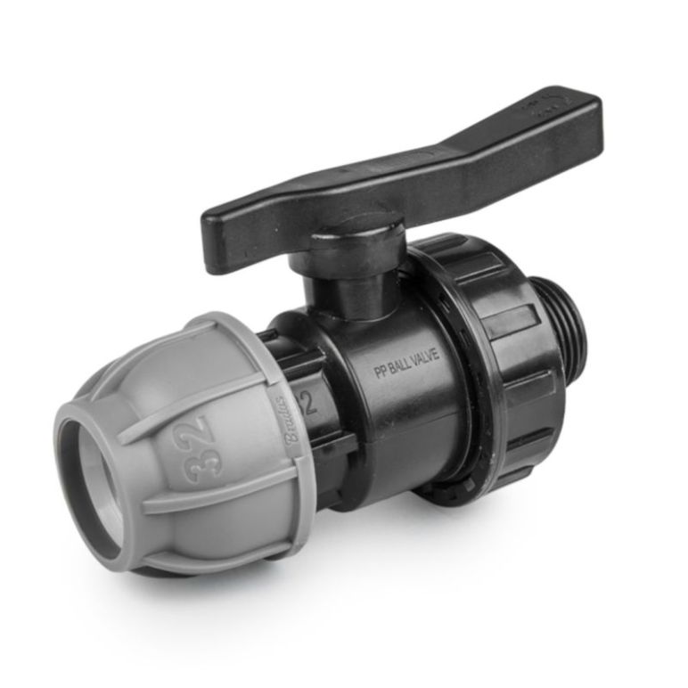 "Kugelhahn mit Außengewinde für PE-Rohre (Verlegrohr) 20-32 mm Technische Merkmale: Material: Polypropylen (PP) Geeignet für PE Rohre (Verlegrohr) Kugelhahn mit Außengewinde Nenndruck: PN10 Farbe: schwarz/grau Größen: 20 mm x 1/2"", 25 mm x 3/4"", 32 mm x 1"""
