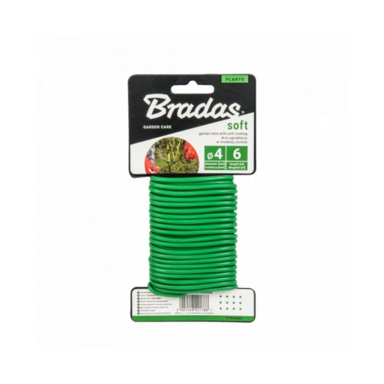 Gartendraht in Grün von Bradas Der SOFT Gartendraht hat eine Weich-PVC-Ummantelung und eignet sich ideal für hochwachsende Pflanzen. Es zeichnet sich durch hohe Festigkeit, Flexibilität und Witterungsbeständigkeit aus. Technische Merkmale: Größen: 3 mm x 8 m, 4 mm x 6 m, 5 mm x 4 m Farbe: Grün Hohe Festigkeit, Flexibilität und Witterungsbeständigkeit Ideal für hochwachsende Pflanzen Weich-PVC-Ummantelung