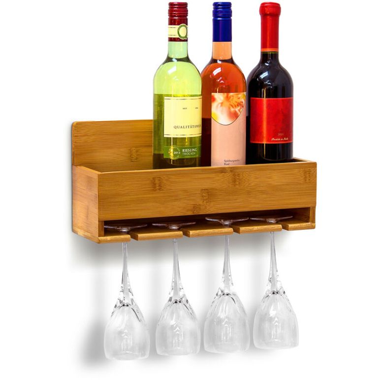 Weinregal mit Glashalter h x b x t: ca. 17 x 37 x 11,5 cm Flaschenregal aus Bambus mit Platz für 4 Flaschen und 4 Gläser zur Wandmontage Hängeregal