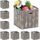 Die praktische Aufbewahrungsbox schafft Ordnung in jedem Raum. Ob für Unterwäsche im Kleiderschrank, Accessoires in der Garderobe, Spielzeug im Kinderzimmer oder Bücher im Wohnzimmer, in der Faltbox sind Ihre Utensilien übersichtlich verstaut. Platzieren Sie die Ordnungsbox dank ihres quadratischen Designs im Schrank oder Regal, wo sie mit den Griffen schnell und einfach herausgezogen werden kann. Bei Nichtgebrauch ist der dekorative Schrankkorb im Nu zusammengefaltet verstaubar. Faltbox im Detail - Maße der Box H x B x T: ca. 29 x 28,5 x 28,5 cm - Innenmaße der Box H x B x T: ca. 28 x 28 x 28 cm - Stauraum: ca. 21 l - Gewicht: ca. 530 g - Material: Vlies, Karton, Metall - Farben: Grau, Gold - Im 8er Set Faltbare Ordnungsbox für Regal oder Schrank - Zur Aufbewahrung im Bad, Wohn-, Kinderzimmer uvm. - Für Spielzeug, Kleidung, Bücher etc. verwendbar - Dekoratives Design in Grau mit goldfarbenen Kakteen - Ideal für Schrank oder Regal - Mit Griffen zum Herausziehen - Bei Nichtgebrauch