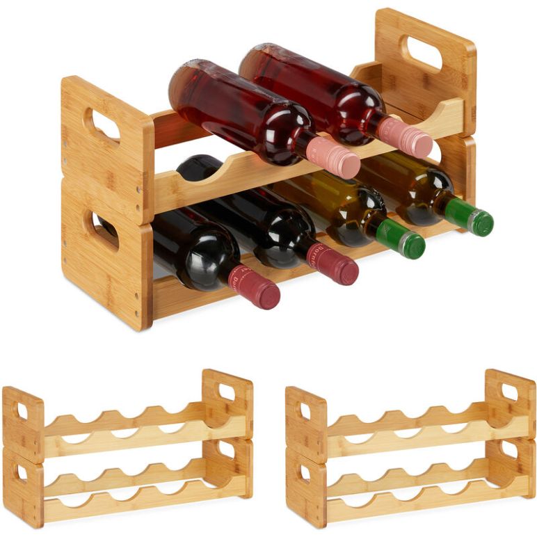 Dieses hochwertige Weinregal aus edlem Bambus fasst auf 2 Ebenen bis zu 8 Flaschen Ihrer Lieblingsweine. Aber auch für andere Getränkeflaschen bietet es großzügigen Stauraum. Das platzsparende Weinflaschenregal besticht dabei vor allem durch seine Natürlichkeit und das flexible Design. Nutzen Sie die 2 Reihen dank der praktischen Griffe einzeln oder gestapelt. Dank der Feuchtigkeitsresistenz des Materials ist das moderne Flaschenregal sowohl für die Küche, als auch die hauseigene Bar geeignet. Weinregal im Detail - Gesamtmaße H x B x T: ca. 24 x 47 x 18 cm - Einkerbungen H x B: ca. 2,5 x 7 cm - Griffe H x B: ca. 3,4 x 8 cm - Gewicht: ca. 1,3 kg - Traglast: ca. 15 kg je Ebene - Material: Bambus - Farbe: Natur - Im 3er Set Getränkeregal für 8 Flaschen - Stauraum für je bis zu 8 Flaschen - Für Wein, Sekt, Wasser uvm. - Ideal für Küche oder Hausbar - Einzeln oder gestapelt platzieren - Optimale Lagerung im Liegen Lieferumfang - 3x Flaschenablage in Einzelteilen - Mit bebilderter Anleitung