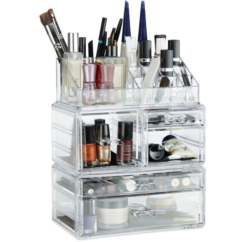 Der stapelbare Make Up Organizer schafft Ordnung auf dem Schminktisch und erspart das Suchen in der Kosmetiktasche. Der dreiteilige Make Up Ständer bietet mit seinen insgesamt 21 Ablagen viel Stauraum für Kosmetik und Schmuck. Die entnehmbaren Schubladen sind sowohl für Cremes, Puder und Lidschatten als auch für Uhren, Ketten und Armbänder geeignet. Der praktische Lippenstifthalter verwahrt überdies Nagellack, Pinsel, Stifte und vieles mehr. Auch auf dem Schreibtisch oder als Aufbewahrung für Nägel, Schrauben und anderes Zubehör macht der Acryl-Organizer eine gute Figur. Make Up Organizer im Detail - Set aus 3 Einzelteilen - Maße H x B x T: ca. 29,5 x 23,5 x 14 cm - Anzahl Ablagen: 21 - Gewicht: ca. 2 kg - Material: Acryl - Farbe: Verschiedene Farben Kosmetik Organizer mit 5 Schubladen - Breite Schublade je B x T: ca. 21 x 12,5 cm - Breite Schubladen Höhe: ca. 3 und 6 cm - Schmale Schublade je B x T: ca. 9,5 x 12,5 cm - Schmale Schubladen Höhe: ca. 3, 6 und 9 cm Lippenstifthalter mit