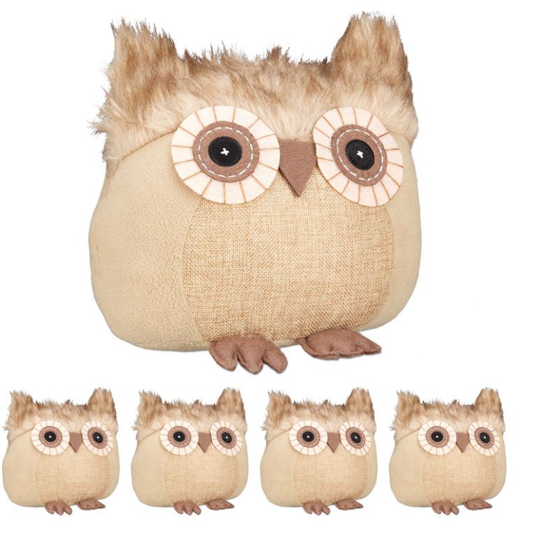 5 x Türstopper Eule, dekorativer Türpuffer, für Boden, stehend, gefüllt, innen, Deko, Stoff Türsandsack, braun