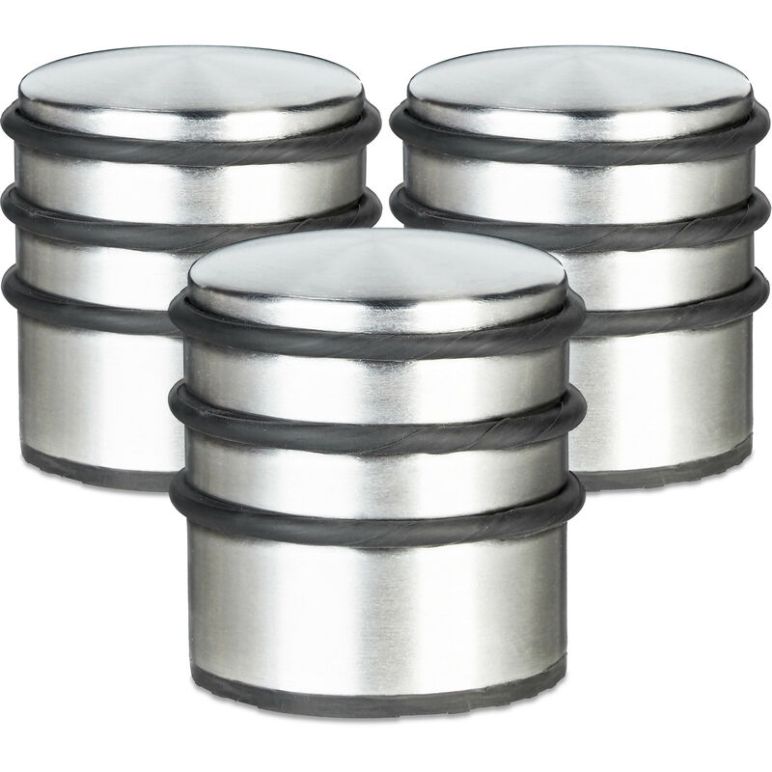 3x Türstopper, Türfeststeller, Türpuffer, Edelstahl, hoch, schwere Türen, Gummischutz, h x d: 7,5 x 7 cm, silber