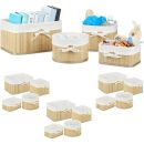 Ordnung ist das halbe Leben. Aber die kleinen Alltagsgegenstände machen es schwer, diese zu halten. Mit dem praktischen 16er Set Aufbewahrungskörbe aus Bambus ist Ordnung nicht nur einfach, sondern auch dekorativ. Die Bambuskörbe sind robust, pflegeleicht und zeitlos schön. Der abnehmbare Stoffbezug aus Polyester schützt den Inhalt. Die Aufbewahrungsboxen passen in jeden Raum und jedes Regal. Verstauen Sie Spielzeug, Badartikel oder Kleidungsstücke wie Socken und Unterwäsche platzsparend. Aufbewahrungskörbe Set im Detail - Materialien: Bambus, MDF-Platte - Polyester Stoffbezug, abnehmbar & waschbar - Farbe: Natur - Im 16er Set Größe und Formen der Körbe - Großer Korb rechteckig H x B x T: ca. 17,5 x 32 x 23 cm - Korb quadratisch H x B x T: ca. 16 x 21 x 21 cm - Kleiner Korb rechteckig H x B x T: ca. 11 x 20,5 x 16 cm - Korb rund H x D: ca. 14 x 20 cm Volumen der Körbe - Großer Korb rechteckig: ca. 12,9 L Volumen - Korb quadratisch: ca. 7,1 L Volumen - Kleiner Korb rechteckig: ca. 4,4