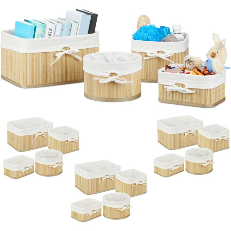 16 x Aufbewahrungskorb Bambus, Aufbewahrungsbox für Regal und Schrank, Dekokorb Stoffeinsatz, Regalkorb, 4 Größen, natur