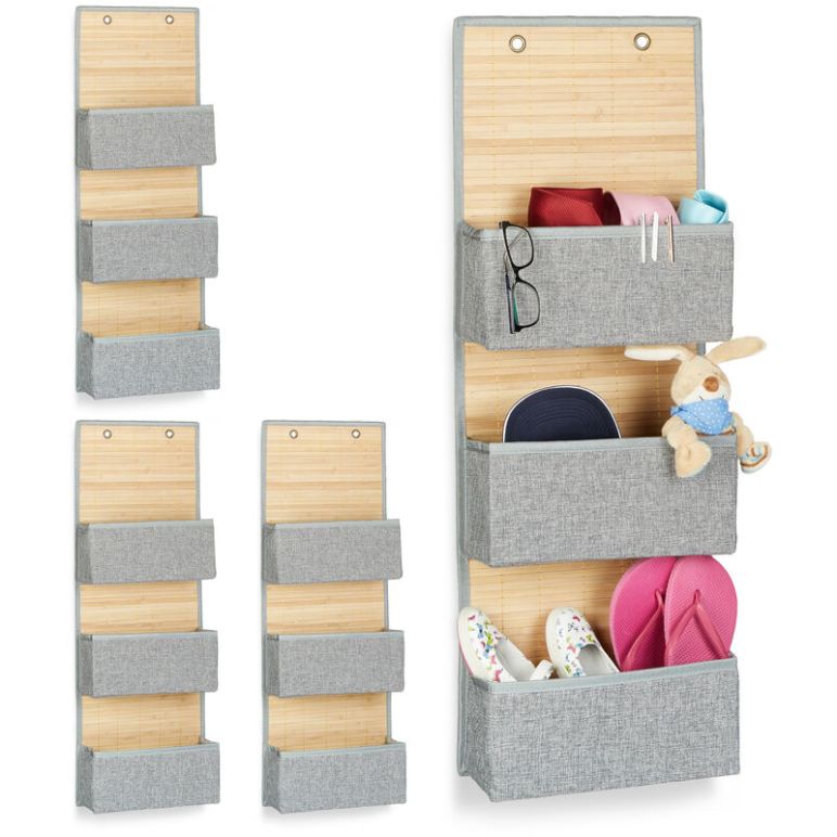 4 x Hängeaufbewahrung, Bad und Flur, Türorganizer 3 Fächer, Bambus und Stoff, Türgarderobe, HxBxT: 94 x 33 x 12 cm, grau