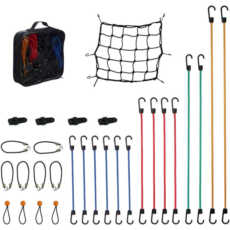 Relaxdays Spanngummi 30er Set, Gepäckspanner, Planenclips, Gepäcknetz, Tragetasche, Universal Expander, mehrfarbig