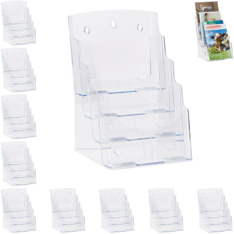 Relaxdays 10 x Prospekthalter A4 / DIN Lang, 4 Etagen, Acryl, Flyer Aufsteller Tisch & Wand, HBT: 35x24,5x24cm, transparent