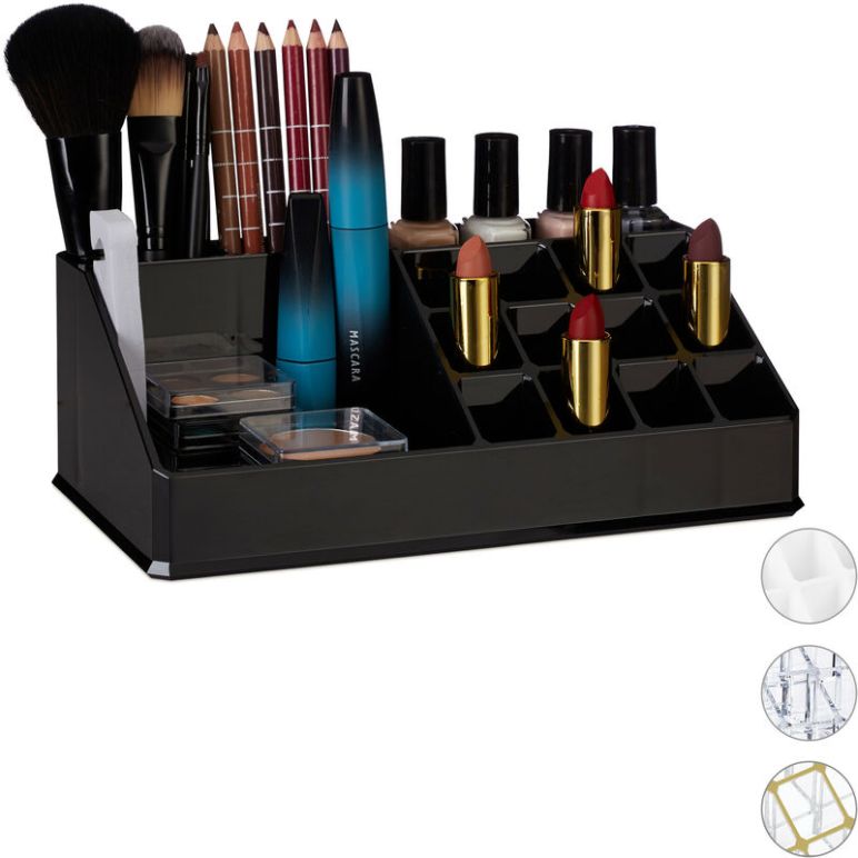 Kosmetik-Organizer Acryl, Kleiner Make Up Organizer mit 16 Fächern für Schminke & Lippenstift-Halter, schwarz - Relaxdays