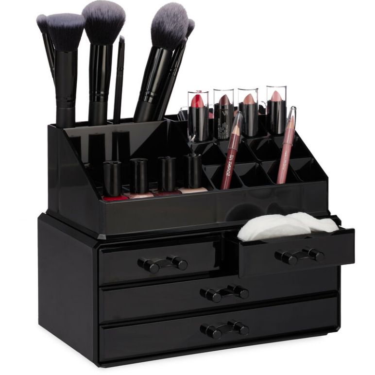 Make Up Organizer klein, 2-teilige Schmink Aufbewahrung Acryl, mit Lippenstifthalter und 4 Schubladen, schwarz - Relaxdays