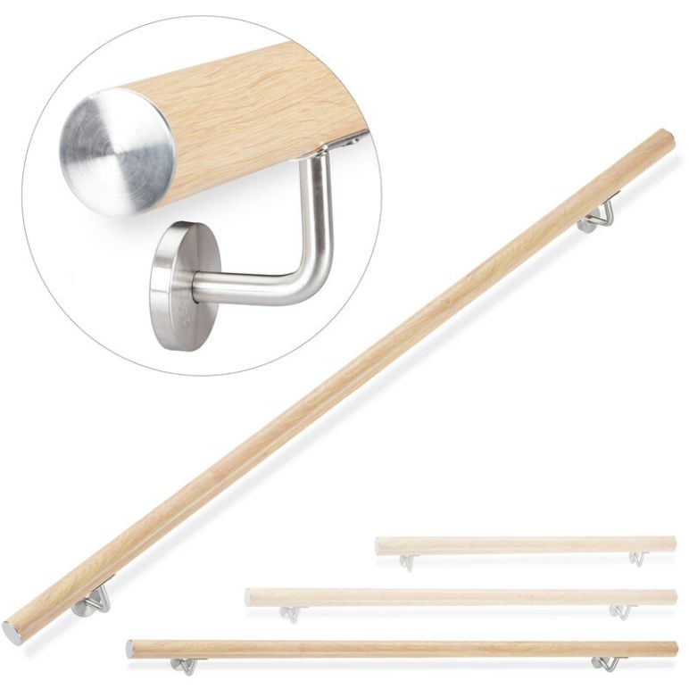 Der Rundhandlauf ist eine tolle Stützhilfe bei Treppen, um Stufe für Stufe sicher nach oben oder unten zu gelangen. Besonders für Kinder, Ältere oder Menschen mit Schwierigkeiten beim Treppensteigen ist das Metallgeländer eine unverzichtbare Hilfe. Im Treppenhaus ist der Alu-Handlauf dabei ebenso nützlich, wie am Hauseingang oder den Terrassenstufen im Garten. Dank des beiliegenden Montagematerials und den bereits montierten Wandhalterungen lässt er sich schnell und unkompliziert anbringen. Mit seiner modernen nachempfundenen Buche-Optik ist das Wandgeländer sowohl im Innen- als auch Außenbereich ein echter Hingucker. Handlauf im Detail - Material: Aluminium, Edelstahl - Farbe: natur, silber - Abstand zur Wand: ca. 4 cm - Durchmesser: ca. 42 mm - Inkl. Wandhalterungen und Montagematerial Metallhandlauf in verschiedenen Größen - Gesamtmaße H x B x T ca. 12 x 100 / 150 / 200 x 8 cm - Abstand Wandhalter (100 cm): ca. 67 cm - Abstand Wandhalter (150 cm): ca. 117 cm - Abstand Wandhalter