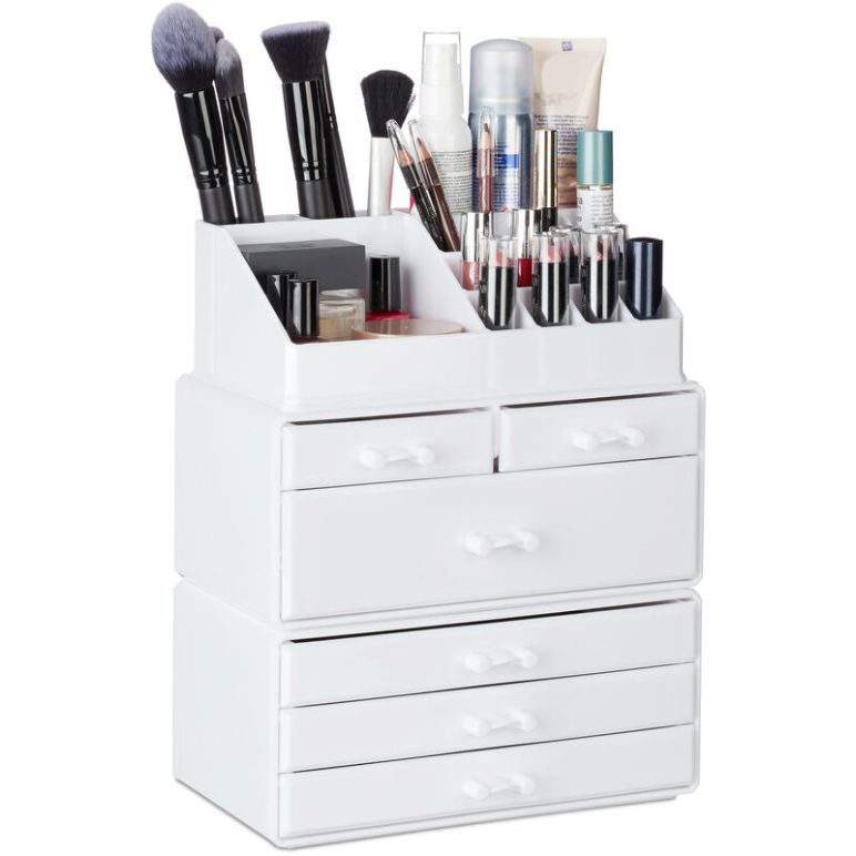 Kosmetikorganizer mit 6 Schubladen, 22 Fächer Make Up Organizer, große Schmink-Aufbewahrung aus Acryl, weiß - Relaxdays