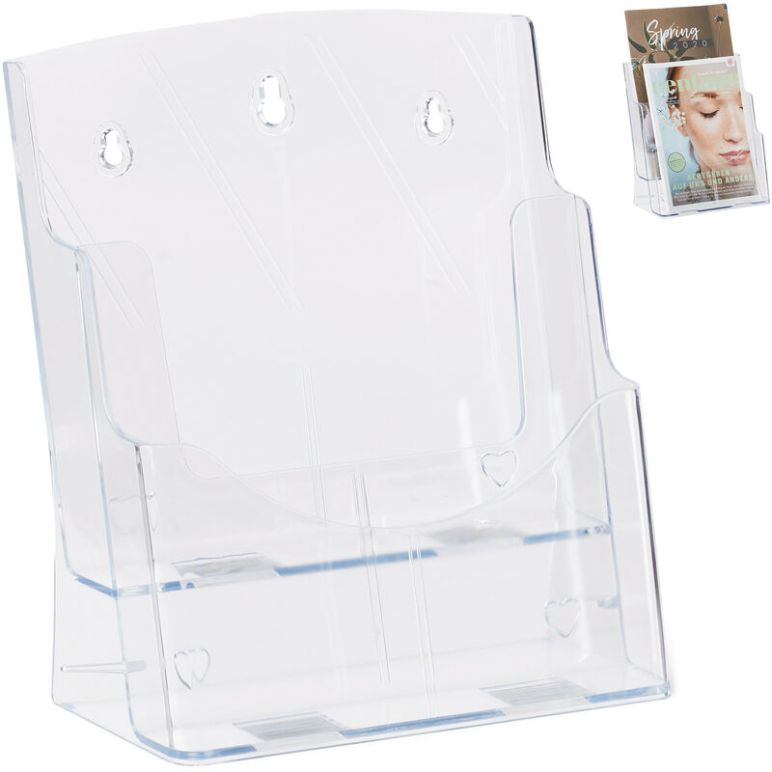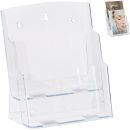 Ihre Flyer, Prospekte und Broschüren präsentieren Sie mit dem zweistufigen Flyerständer wirkungsvoll auf Tisch und Tresen oder an der Wand. Vor allem auf Messen und Veranstaltungen, aber auch im Wartezimmer oder an Empfang und Rezeption setzen Sie Ihre Werbemittel mit dem Flyerdisplay für Kunden gut sichtbar in Szene. Der Broschürenständer mit leicht geneigter Rückwand ist aus robustem Kunststoff gefertigt und eignet sich dank entnehmbarer Trennwand für Flyer im DIN A4 oder DIN Lang Format. Prospekthalter im Detail - Gesamtmaße H x B x T: ca. 27,5 x 24 x 15 cm - Fachmaße ohne Trennwand je B x T: ca. 23 x 4 cm - Fachmaße mit Trennwand je B x T: ca. 11,5 x 4 cm - Format: DIN A4 oder DIN Lang - Gewicht: ca. 500 g - Material: Acryl - Farbe: Transparent Prospektständer für Tisch und Wand - Für Flyer, Flugblätter, Prospekte im A4 oder DIN Lang Format - Werbemittel wirkungsvoll und dekorativ präsentieren - Perfekt für Wartezimmer, Messen, Veranstaltungen - Für Theke, Tresen, Tisch oder auch