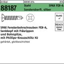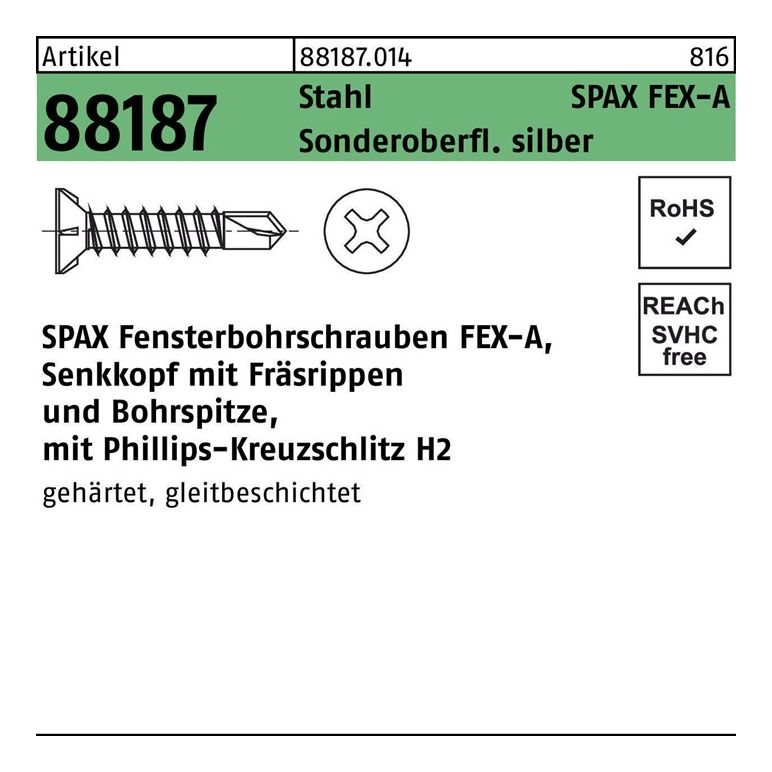 Artikel 88187 Stahl SPAX FEX-A Sonderoberfl. silber SPAX Fensterbohrschrauben FEX-A mit Senkkopf · Bohrsp. · Phillips-KS - Abmessung: 3,9 x 19 -H VE=S (1000 Stück)Weitere technische Eigenschaften:· Gruppencode 88187.014· Normart REYHER-Artikel 88187· Produkt-Typbezeichnung SPAX Fensterbohrschrauben FEX-A, Senkkopf mit Fräsrippen und Bohrspitze, mit Phillips-Kreuzschlitz H2