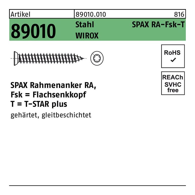 Artikel 89010 St. SPAX RA-Fsk-T Oberfläche WIROX SPAX Rahmenanker RA · Flachsenkkopf · mit T-STAR plus - Abmessung: 7,5 x 40 -T30 VE=S (100 Stück)Weitere technische Eigenschaften:· Gruppencode 89010.010· Normart REYHER-Artikel 89010