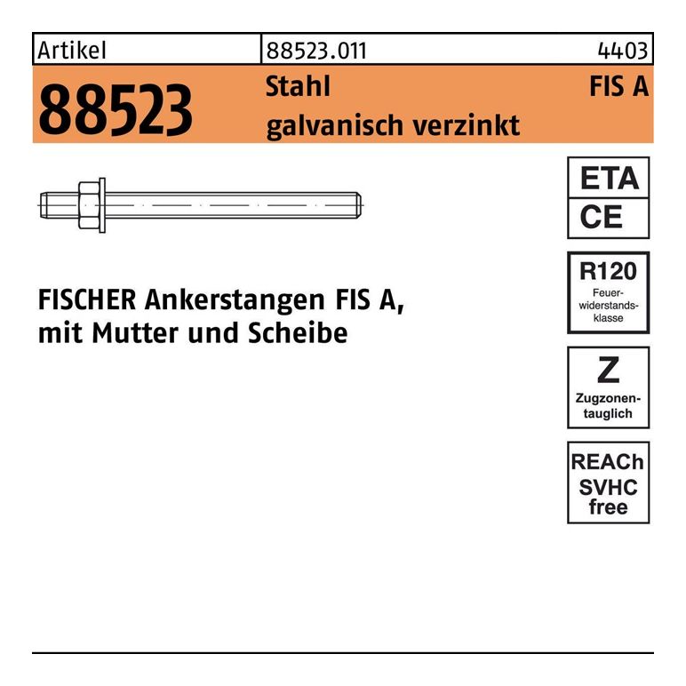 Artikel 88523 Stahl FIS A galvanisch verzinkt FISCHER Ankerstangen FIS A · mit Mutter und Scheibe - Abmessung: FIS A M 10x130 VE=S (10 Stück)Weitere technische Eigenschaften:· Ausführung: FISCHER Ankerstangen FIS A, mit Mutter und Scheibe· Werkstoff: Stahl· Gruppencode 88523.011· Normart REYHER-Artikel 88523· Oberfläche galvanisch verzinkt