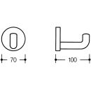 großer, rechtwinklig gebogener, zylindrischer Haken mit Befestigungsrosette · geradlinig und funktional in einer einfachen und zeitlosen Formensprache gestaltet · der Haken dient zum Aufhängen von Kleidungs- und Wäschestücken · leicht zu reinigen · diebstahlgeschützt durch verdeckte Verschraubung · 100 mm tief, Rosettendurchmesser 70 mm · aus hochwertigem Polyamid in ausgewählten HEWI Farben