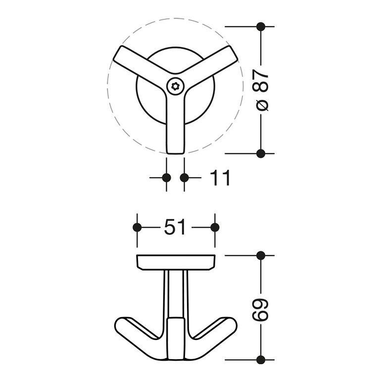 elastisch · nachgebendes Material, weiche Haptik und abgerundete Kanten reduzieren Stoß- und Verletzungsgefahr · dient zum Aufhängen von Kleidungsstücken und anderen Utensilien · drehbarer Haken zum Aufschrauben von unten · Ø Rosette 51 mm · B 80 x H 69 mm · aus Kunststoff (TPU) · Oberfläche matt · Belastungsempfehlung max. 5 kg je Hakenteil · verdeckte Befestigung · TÜV Rheinland geprüft, Zertifizierungsnr. S 6013699