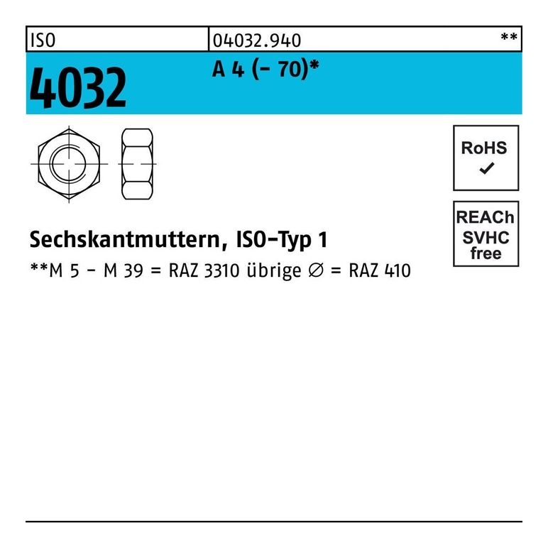 ISO 4032 A 4 - 70 Sechskantmuttern · ISO-Typ 1 - Abmessung: M 4* VE=S (1000 Stück)Weitere technische Eigenschaften:· Gruppencode 04032.940· Normart ISO 4032