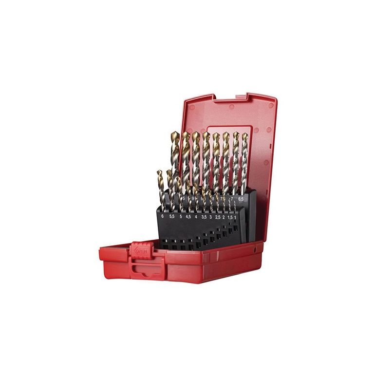 Bohrerset in STANDARD-Plastikbox bestehend aus 19 spiralbohrer Bohrer mit Zylinderschaft · A002 Durchmesser 1.0 bis 10.0mm mit Größensteigung von 0.5mm · gemäß DIN 338 Standard mit 118° modifizierter Kreuzanschliff · HSS mit TiN-Spitzen-Beschichtung für 4xD Bohrungen ohne Zentrierung in StahlWeitere technische Eigenschaften:· Modell: A095 · 201