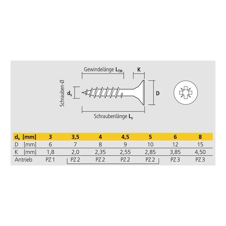 ETA Zulassung ∙ perfekte Kraftübertragung ∙ optimal für Holz und Beschläge ∙ patentierter vorderer Gewindebereich vermindert Spalten und reduziert das Einschraubdrehmoment · gelb verzinkt · innenliegende Unterkopffrästaschen 3,5 x 25 bis 3,5 x 50 und 4 x 25 bis 5 x 90außenliegende Unterkopffräsrippen 6 x 40 bis 6 x 220/70Schaftfräser ab Ø 6 x 80