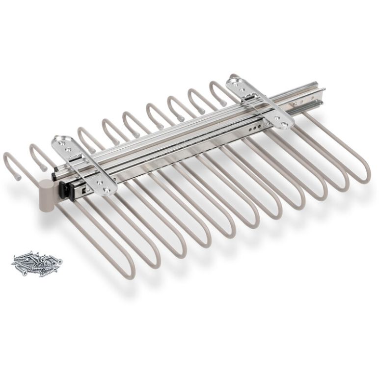 Die ausziehbare Hosenstange Self erlaubt die effiziente Nutzung des Innenbereichs von Schränken und Kleiderschränken und ermöglicht den Zugang zu den Kleidungsstücken. Sie besteht aus verchromtem Stahl und verfügt über Kugelführungen mit Vollauszug. Besteht aus 11 Stangen für den Aufhang von Hosen , der Griff an der Vorderseite erleichtert den Auszug. Es ist aus Stahl mit Lackierung in steingrauer Farbe hergestellt. Kann rechts oder links angebracht werden. Kugelführungen für den vollständigen Auszug. Die Feder erleichtert den Auszug. Besteht aus 11 Stangen für das Aufhängen von Hosen. Schrauben zur Montage enthälten. Enthält rutschfeste Gummis. 1 ausziehbare Hosenstange, Montageschrauben, Schrauben zur Montage