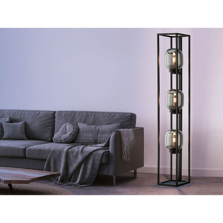 Lichtdesign in seiner schönsten Form verspricht diese angesagte, 3flammige Vintage Stehlampe: Unkonventionell, kreativ und designorientiert! Minimalistische Leuchten wie diese Honsel Stehlampe setzen spannende Akzente und rücken Räume ins rechte Licht. Die Auswahl der Farben und Formen schafft Kontraste - geschickt kombiniert entstehen eine gemütliche Komponente und ein stilvolles Ambiente. Die Designstehleuchte setzt sich aus einem geradlinigen Leuchtenkorpus aus schwarzem Metall sowie drei kolbenförmigen Rauchglasschirmen mit einem Durchmesser von jeweils 16 cm (Schirmhöhe jeweils 20 cm) zusammen. Der Retro Look wird durch den angesagten Farb- und Materialmix perfekt abgerundet und sorgt für ein tolles Erscheinungsbild. Durch die Metall- und Glasdetails ist die Leuchte in jedem Fall sehr dekorativ und lässt sich in viele Einrichtungsstile perfekt integrieren. So sorgt die 130 cm hohe Stehleuchte als zusätzliche Lichtquelle neben der Grundbeleuchtung für ein sanftes, atmosphärisches