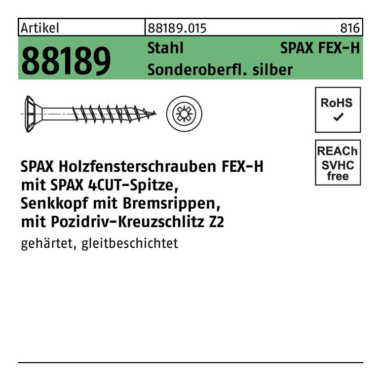 Artikel 88189 Stahl SPAX FEX-H Sonderoberfl. silber SPAX Holzfensterschrauben FEX-H mit Senkkopf · Bremsrippen · Pozidriv-KS - Abmessung: 4 x 30 -Z VE=S (1000 Stück)Weitere technische Eigenschaften:· Material: Stahl· Form: SPAX FEX-H· Gruppencode: 88189.015· Normart: REYHER-Artikel 88189