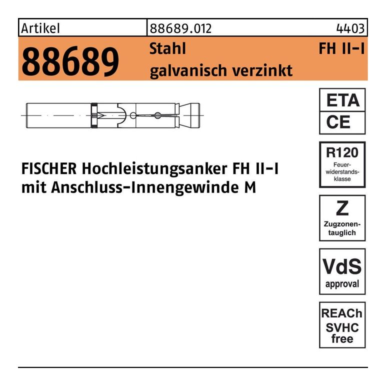 Artikel 88689 Stahl FH II-I galvanisch verzinkt FISCHER Hochleistungsanker FH II-I mit Anschluss-Innengewinde M - Abmessung: FH II 12/M 6 I VE=S (25 Stück)Weitere technische Eigenschaften:· Durchmesser 12mm· Gruppencode 88689.012· Länge 6mm· Normart REYHER-Artikel 88689· Oberfläche galvanisch verzinkt