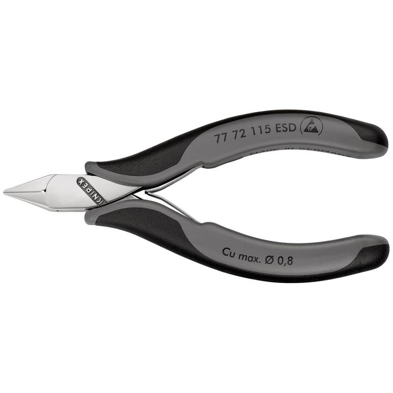 Für feine Schneidarbeiten, z. B. in Elektronik und Feinmechanik. Griffe elektrisch ableitend – dissipativ. Stabiles, durchgestecktes und spielfreies Gelenk. Reibungsarme Doppelfeder für ein sanftes und gleichmäßiges Öffnen. Die Spiegelpolitur bietet in Verbindung mit einem feinen Ölfilm einen guten Rostschutz – keine Störungen im Schaltkreis durch abblätternde Chromteile. Schneiden zusätzlich induktiv gehärtet, Schneidenhärte ca. 62 HRC. Griffe mit zweifarbigen Mehrkomponenten-Hüllen schwarz/grau. spitzer Mini-Kopf, mit kleiner Facette. Schneidenhärte ca. 60 HRC.