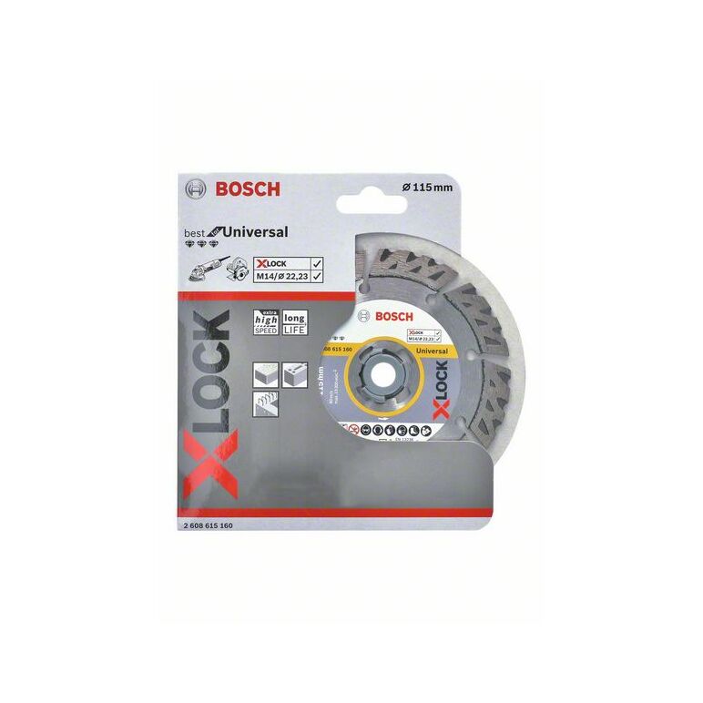 Die X-LOCK Trennscheibe Best for Universal Diamond bietet eine hervorragende Nutzungsdauer bei allgemeinen Baumaterialien wie z. B. Beton, armiertem Beton, Mauerwerk, Sandstein, Kalkstein und Dachpfannen. Ihr neues Segmentdesign Waves Edge Shape produziert weniger Vibrationen und reduziert die Reibung für glatte Schnitte. Die hervorragende Nutzungsdauer der Scheibe ist den speziellen sandwichartigen Diamantsegmenten zu verdanken, wobei die regelmäßige Verteilung der Diamanten und die verstärkte metallische Bindungskraft die Robustheit noch erhöhen. Geeignet zum Schneiden von Beton und Mauerwerk. X-LOCK Trennscheiben passen auch auf Standard-Winkelschleifer. Dank schlüssellosem X-LOCK System lassen sich die Trennscheiben schnell und bequem wechseln. Durchmesser mm: 115, Bohrungsdurchmesser mm: 22,23, Schnittbreite mm: 2,4, Segmenthöhe mm: 12, X-LOCK.
