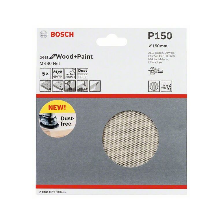 Bosch Schleifblatt M480 Net, Best for Wood and Paint, 150 mm, 150, 5er-Pack (2 608 621 165)
