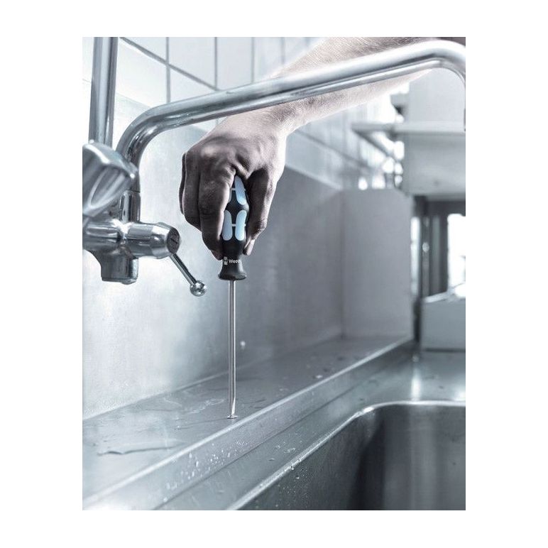 Hochwertiger Kraftform Plus Schraubendreher aus Edelstahl. Die Edelstahlwerkzeuge von Wera sind vakuumeisgehärtet und verfügen damit über die für Verschraubungen benötigten Härten und Festigkeitswerte. Der industrielle Einsatz ist ohne Einschränkungen möglich. Mehrkomponentiger Kraftform Griff für schnelles und schonendes Arbeiten. "Take it easy" Werkzeugfinder mit Farbkennzeichnung nach Profilen und Größenstempelung - zum einfachen und schnellen Finden des benötigten Werkzeugs. Der Sechskantabrollschutz verhindert lästiges Wegrollen am Arbeitsplatz.