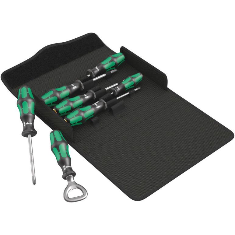 6-teiliges Schraubendreherset mit Kraftform Plus Griff für angenehm ergonomisches Arbeiten, bei dem Blasen und Schwielen vermieden werden. Harte Griffzonen für hohe Arbeitsgeschwindigkeit, während weiche Griffzonen hohe Drehmomentübertragung garantieren. Teilweise mit Lasertip: Die Spitze krallt sich im Schraubkopf fest und verhindert das Herausrutschen. Take it easy Werkzeugfinder mit Farbkennzeichnung nach Profilen und Größenstempelung - zum einfachen und schnellen Finden des benötigten Werkzeugs. Der Sechskantabrollschutz verhindert lästiges Wegrollen am Arbeitsplatz. Plus Wera Kult-Flaschenöffner.