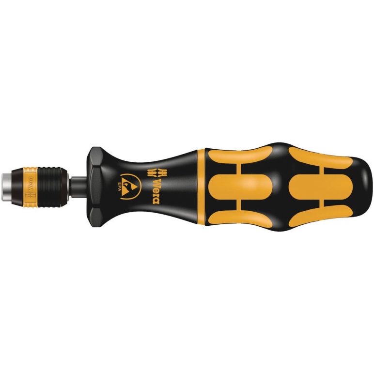 Wera Drehmomentschraubendreher. Sicherer Schutz vor elektrostatischer Energie und damit verbundenen Schäden. Mit nach Kundenwunsch werkseitig fest voreingestelltem Drehmomentwert. Für alle Anwendungen, bei denen konstant dasselbe Drehmoment benötigt wird und Wiederholgenauigkeit gefordert ist. Der Drehmomentwert kann mit einem Extra-Werkzeug innerhalb des Messbereichs verändert werden (Re-Kalibrierungs-Kit, bestellbar mit Codenummer 05137003001). Danach mit einem handelsüblichen Drehmomentprüfgerät den eingestellten Wert überprüfen. Unbegrenztes Lösemoment zum Lösen festsitzender Schrauben. Rapidaptor-Schnellwechseltechnologie für blitzschnellen Bit-Wechsel. Geeignet für Bits mit 1/4"-Außensechskantantrieb nach DIN ISO 1173-C 6,3 und E 6,3 (ISO 1173). Mehrkomponentiger Kraftform-Griff mit Hart- und Weichzonen für hohe Arbeitsgeschwindigkeiten und zur Schonung der Handfläche.