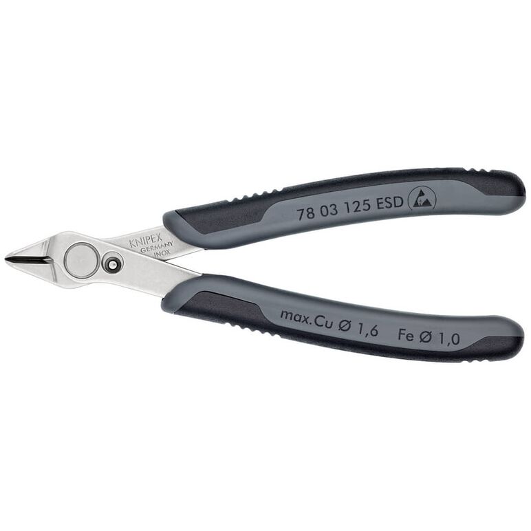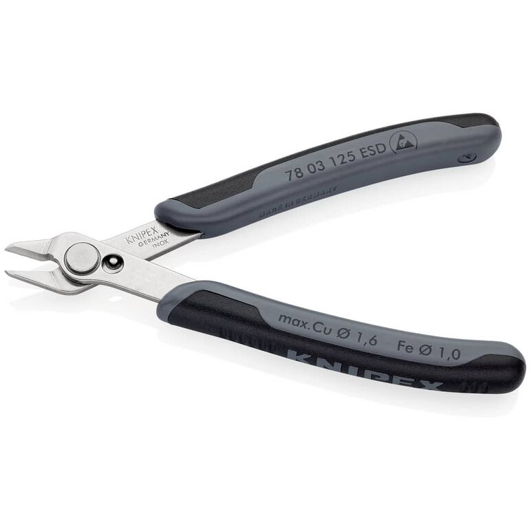 Präzisionszangen für feinste Schneidarbeiten, z. B. in Elektronik und Feinmechanik. Griffe elektrisch ableitend – dissipativ. Geschliffene, sehr scharfe Schneiden ohne Facette. Scherschnitt mit kontrolliertem Micro-Schneidkantenversatz für lange Lebensdauer und ultrapräzisen Schnitt auch dünnster Drähte. Exakt geformte Spitzen schneiden auch anliegende Drähte ab Ø 0,2 mm. Gelenk mit Edelstahlniet. Extrem leichter Gang für ermüdungsarmes Arbeiten. Mit Öffnungsfeder und Öffnungsbegrenzung. Schneiden zusätzlich induktiv gehärtet, Schneidenhärte ca. 64 HRC. INOX - Werkzeugstahl.