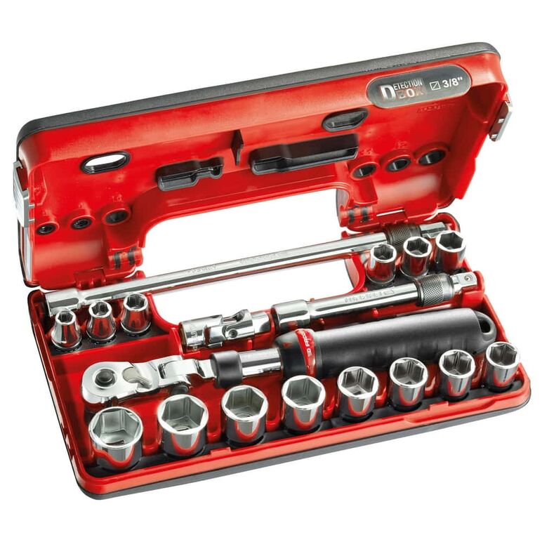 Sortiment 3/8" - Antriebselemente, Sechskant-Steckschlüssel, Umschaltknarre | Detection-Box, 18-tlg.
