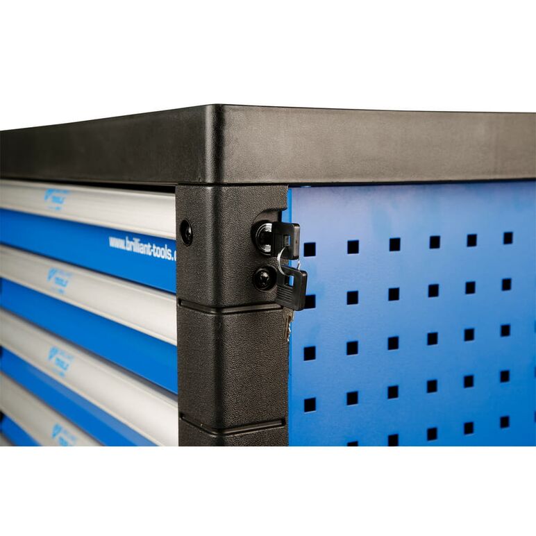 Der hochwertig pulverbeschichtete BRILLIANT TOOLS Profi Werkstattwagen BT153473 ist immer dort, wo er gerade gebraucht wird! Lästiges hin und her laufen gehört der Vergangenheit an! Mithilfe der ergonomischen in die Kunststoffablage integrierten Schiebegriffe lässt er sich ziemlich leicht durch die Werkstatt manövrieren und dabei schützt der Kantenschutz an den Ecken bei Kollisionen. Dank seiner 2 Feststellbremsen an den Lenkrollen bleibt er sicher am Zielort stehen.